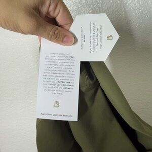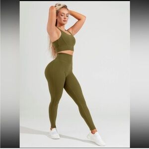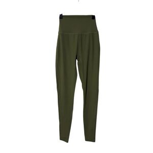 High-waisted olive green leggings. Sleek and comfortable design. Perfect for workouts or casual wear.