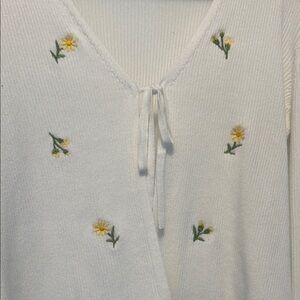 Chic white cardigan with delicate floral embroidery. Features a tie front for a stylish look.