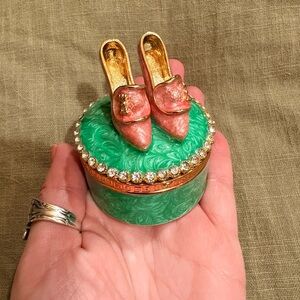 This exquisite tchotchke trinket box features a beautifully crafted shoe design in green, pink, and gold. Perfect jewelry box for adding a touch of elegance to your decor or gifting to a loved one. Use it as a trinket, treasure, or jewelry box. Brand new in box.