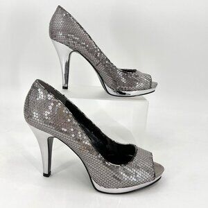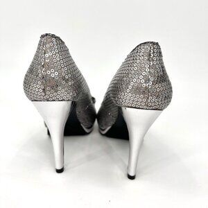 Bring in the party with this fabulous pair of shoes from Nine West! Liquid metallic silver heels, silver sequin, open toe, size 7. The interior material and edges are peeling, some sequin missing and a slightly darker spot on outside of right shoe - see pictures. Still a great pair of shoes! Tags on bottom. Size 7. Originally $79!