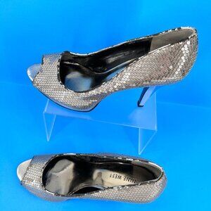 NWT NINE WEST METALLIC SILVER HEEL SEQUIN OPEN TOE HEELS - 7