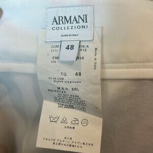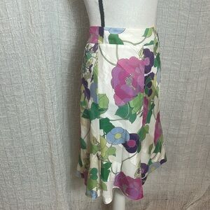 Discover the elegance of the Armani Collezioni A-line skirt, designed in a striking purple and green floral pattern. This knee-length skirt is perfect for resort wear, offering a chic and casual style with a subtle slit for added flair. The vibrant colors and classic design make it a standout piece for any wardrobe. Size 48 Italian = XL