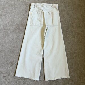 These Zara jeans feature a chic cream color and a stylish flare and wide-leg design. The high-rise waist and relaxed silhouette offer a comfortable yet elegant look, perfect for versatile styling.