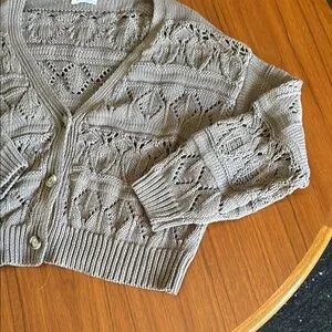 This tan cardigan showcases a ribbed texture and a striking geometric design, perfect for adding a stylish touch to your cool-weather wardrobe. Its medium weight and cropped length offer both comfort and a contemporary look. The neutral tan color ensures versatility, making it an essential piece for any outfit.