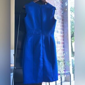 The Tahari ASL dress is a sophisticated midi dress in a striking blue hue, perfect for work or cocktail events. It features a sleeveless design with a crew neckline, offering a sleek and modern silhouette. Crafted from a structured fabric, this dress maintains its shape beautifully, ensuring a polished look throughout the day.
