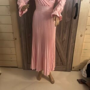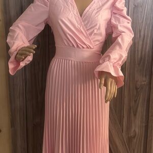 This elegant pink wrap dress features a flattering pleated skirt and stylish long sleeves. Perfect for any occasion, it offers both comfort and style.