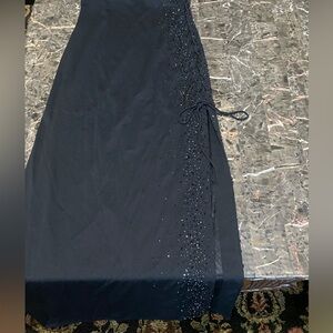 Niki Livas Black Spaghetti Strap Beaded Embellished Long Formal Gown w/side laced and slit SZ 4. Condition is Pre-owned