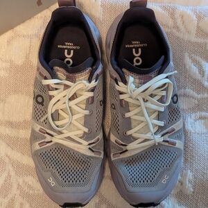 Women's size 9 OC cloudsurfer trail sneakers, I wore them once out on a trail to run and they just aren't the feel I like. Although they are breathable and comfortable I enjoy more of a stiff trail shoe. As shown in the photos there is small scuff holes on the fabric from where my inner ankles rubbed together on the trail by accident. They are clean, no smells, come with box. Ready to ship. please ask any questions!