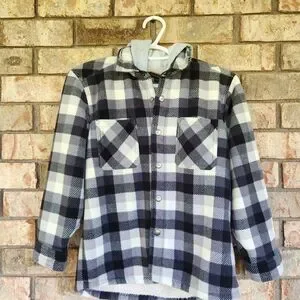 Stylish black and white fleece lined plaid hoodie/jacket with button closure. Features two front pockets. Youth Medium. Soft on the inside, great for fall.