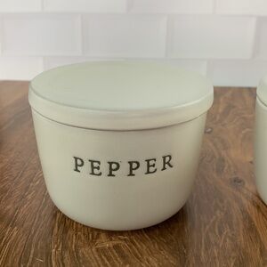 This set includes 3 items, the salt and pepper storage stoneware and also includes the spoon rest holder from hearth and hand magnolia stone salt and pepper. Features the word "Salt" and “pepper “ engraved on the front in a rustic font and ivory colored stoneware