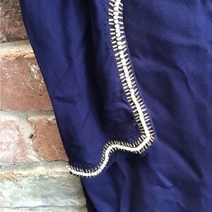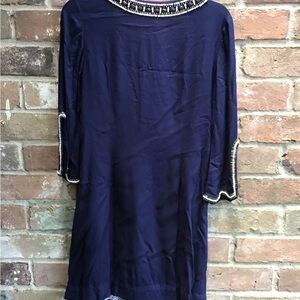 Navy cover up with gorgeous beaded collar and wrist. Lightweight and rounded collar. 35 inches long, 32 bust and gently used.
