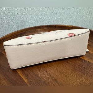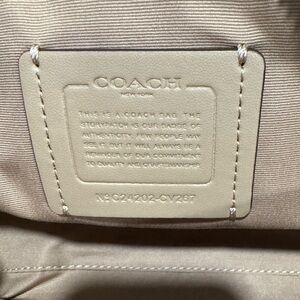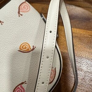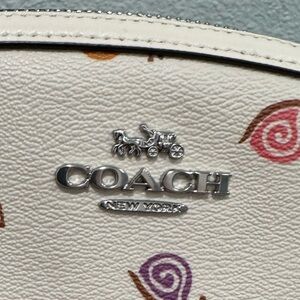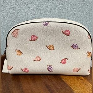 This Coach cosmetic bag showcases a delightful cream color scheme with a charming snail print. Crafted with a smooth, structured finish, it offers a stylish way to organize your essentials. The compact dome shape and zipper closure make it perfect for travel or daily use. The straps are adjustable.