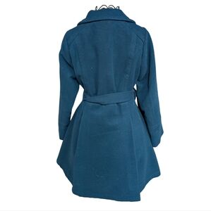 This coat is in like-new, pre-owned condition. Please note there is a slight, light blemish on the left shoulder (as seen in photos) that is only visible when the collar is lifted – otherwise, it's virtually unnoticeable. The vibrant teal color and unique design make it perfect for adding a pop of color to your fall and winter wardrobe.