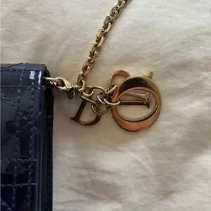 Christian Dior Lady Purse with chain in navy blue. This has been loved dearly! Some of the coating on the chain / Dior keychain is starting to rub off and there is some minor scratching inside the purse. Price reflects this!