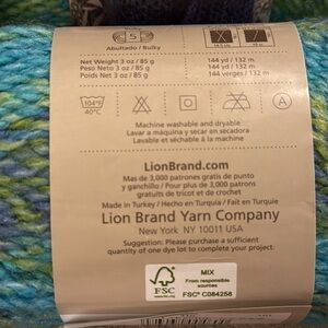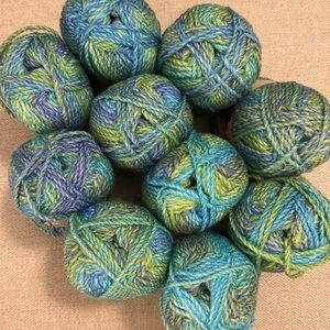 Bundle of 10 Lion Brand yarn in Aqua blue. Perfect for knitting and crochet projects. Lion Brand Tweed Stripes yarn featuring a blend of blue and green hues. Perfect for knitting and crochet projects.