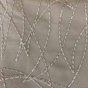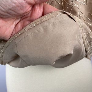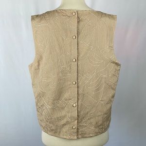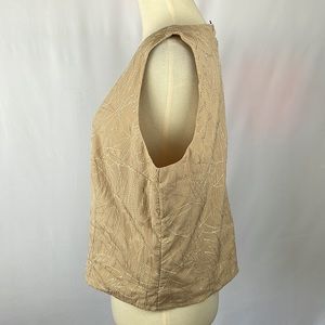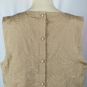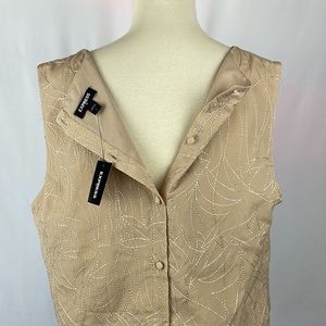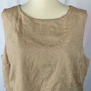 NWT. Brand new with tags. Tan shell, sleeveless blouse with buttons down the back from Express. Round neckline and darts at bust. Gorgeous, sparkly, metallic thread design. Fully lined. Dressy blouse will look beautiful for holiday/Christmas party, wedding guest, or other fancy events. Size Large.