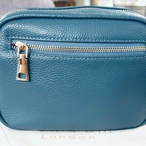 The Pom Pom London STEEL BLUE Mayfair/Original bag is a small rectangular-shaped crossbody bag with a zip closure and gold-plated hardware measuring 8 x 3 x 6 inches. Made from leather with a pebbled finish, this stylish bag features two detachable crossbody straps and a solid steel blue exterior color. Perfect for women looking for a chic and personalized accessory that embodies the London theme, this bag exudes sophistication and elegance. Made in the United Kingdom by the brand pom pom london, this bag is a discontinued color that is still in excellent used condition.