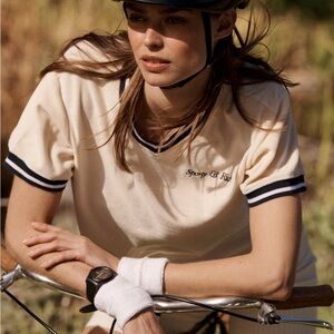 Sporty and Rich Italic Logo Embroidered V-Neck Tee - Cream/Navy