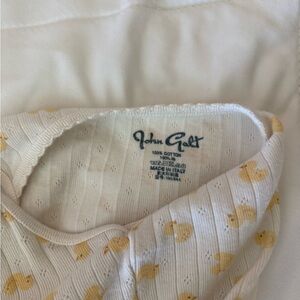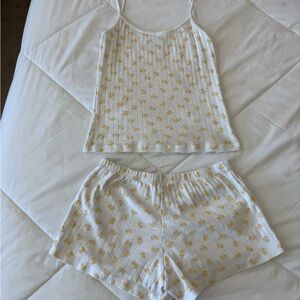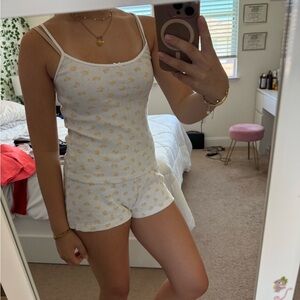 Experience ultimate comfort with this Brandy Melville pajama romper, featuring a delicate floral pattern in white and gold. The fitted bodice and mid-thigh shorts offer a stylish and cozy fit, perfect for lounging or sleeping.