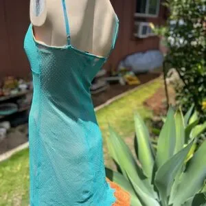 Turquoise dress with vibrant orange lace details. Very cute Y2K/90s style. Stretcbnover head, no zipper. Repaired straps. See photo for stiching.