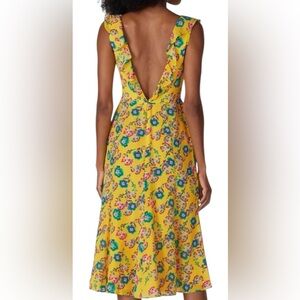 This silk SALONI yellow dress is perfect for a wedding guest, cocktail event or any time. This sleeveless midi dress features a striking plunge neckline and flutter sleeves, offering a chic and sophisticated look. The vibrant yellow hue, complemented by blue floral accents, adds a touch of resort wear charm to your wardrobe. 💯% Silk.