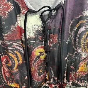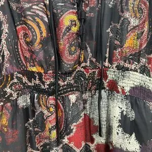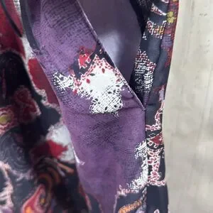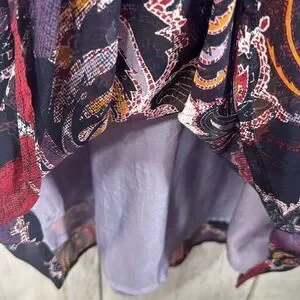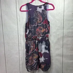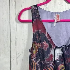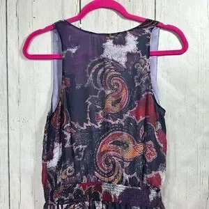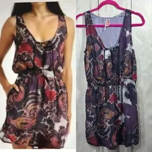 This dreamy Free People mini dress features a bold, swirling paisley pattern in rich hues of red, purple, and cream. Designed with a flattering sleeveless cut, a lace-up neckline, and a cinched elastic waist, it combines comfort with effortless style. Lightweight and perfect for warm-weather outings or layering in transitional seasons. Great for festivals, weekend brunches, or relaxed boho styling.