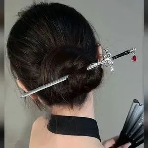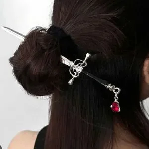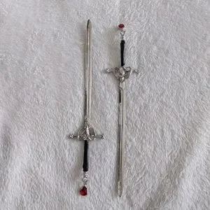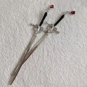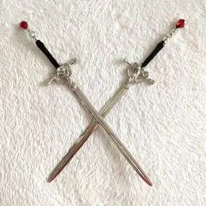 This pair of long sword Hairpins have delicate weaving at the hilt and a droplet of blood red gem dangling from the end. Wear one at a time or criss crossed together. Ideal for cosplay and Renaissance Faire events! Or just an everyday edgy look.