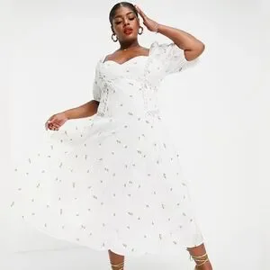 ASOS DESIGN Curve Premium puff sleeve trapeze midi dress Size 12 Cottage Core