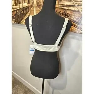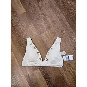 Michael Kors swim top in a chic bone color. Designed for comfort and style, this bikini top features gold accents along the neckline, providing a trendy touch. The adjustable straps ensure a customized fit, while the soft fabric offers comfort throughout your beach day. Perfect for mixing and matching with your favorite swim bottoms, this top is an essential addition to your summer wardrobe.