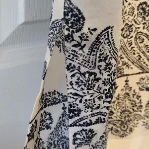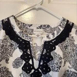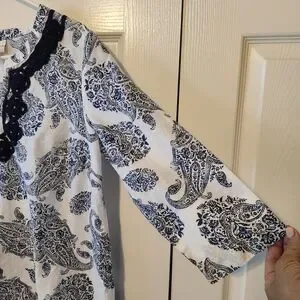 Womens paisley print blouse with three-quarter quarter sleeves and a unique blue embroidered collar.