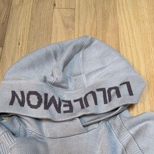 Cozy gray hoodie with front pocket and hood. Features Lululemon branding on the hood.