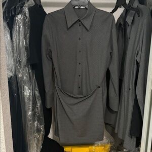 Gray button down shirt dress with front wrap skirt detail. 70% polyester, 29% viscose, 1% elastane. New without tags. Bundle and save!