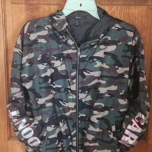 Forever 21 Medium Camo Windbreaker with Red Don't Care Accents On Sleeves