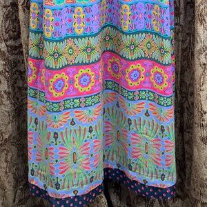 Up for sale is a vintage Alex Coleman maxi featuring a distinctive psychedelic/Op Art print, characteristic of the 1960s and early 1970s fashion era. This dress embodies the iconic "maxi dress" style. The bold, colorful patterns are reminiscent of that era. This dress features a high mock neck collar and long sleeves with a fitted bodice and a flowing skirt that extends to the ankles or floor. The intricate, repeated patterns in bright hues of pink, orange, green, blue, and purple are a hallmark of the aesthetic. Due to the nature of pre-loved vintage items, all merchandise is sold as-is. Please review the description and pictures before making a purchase.