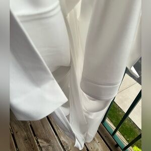 Crafted in a smooth, stretch winter white fabric, it features a chic mock neckline, sleeveless cut, and a sleek silhouette with a side slit for subtle allure.