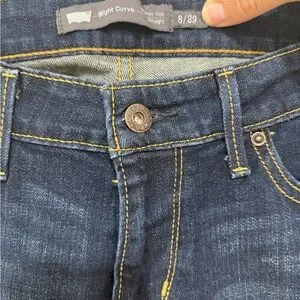 Flattering and comfortable, these Levi’s Demi Curve jeans feature a classic straight leg cut in a dark blue wash. Designed to enhance natural curves with a mid-rise fit. Zip fly closure. Gently worn.