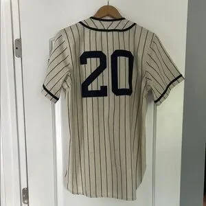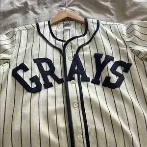 Mitchell & Ness Homestead Grays navy blue pinstripe baseball jersey featuring home run hitting legend Josh Gibson’s #20 with a classic design. Perfect for casual outings or sports events.