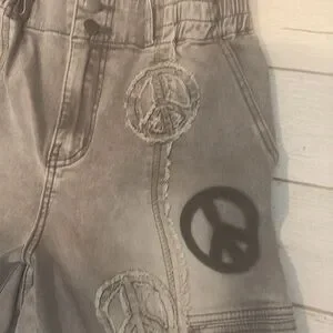 Embrace a unique style with these gray roomy jeans from Oli & Hali, featuring eye-catching peace sign designs. Crafted for a sleek and modern fit, these jeans offer both comfort and a statement look. Perfect for casual outings, they effortlessly combine trendiness with individuality.
