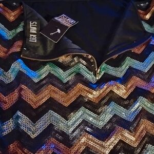 Step into the spotlight with the Sunny Leigh Pink and Green Sequin Mini Skirt. This pencil-style skirt is adorned with shimmering sequins, making it the perfect choice for a cocktail party or a night out. Its mini length and vibrant colors ensure you stand out in any crowd. Elevate your evening wear with this dazzling piece.