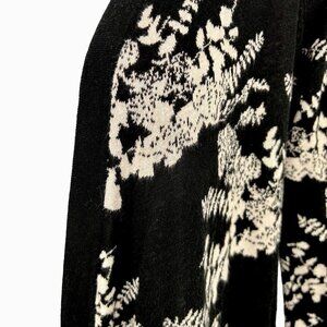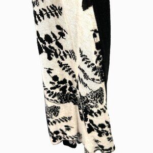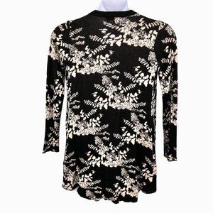 Pretty, open front cardigan sweater from Belldini! Black & ivory floral print with reverse on interior. Size small, higher in front than back with ruffled, flowy bottom. Long sleeves, 60% cotton, 40% viscose. Gently worn but in nice condition. Color(s) may vary slightly in pictures but are as close as possible.