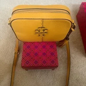 Chic Tory Burch crossbody camera bag in vibrant yellow. Perfect for adding a pop of color.