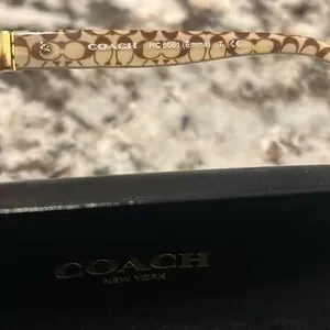 Elegant Coach glasses featuring a black frame with gold accents. Stylish patterned arms add a unique touch. Style name Emma HC6061