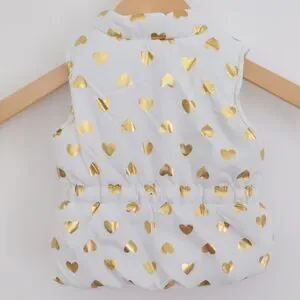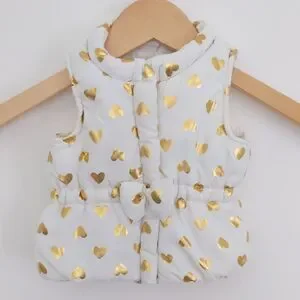Adorable kids puffer vest featuring a charming gold heart pattern. Perfect for adding a touch of style to any outfit.