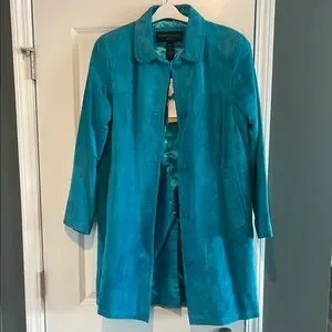 Elevate your style with this chic teal trench coat, perfect for any occasion. Excellent condition. Sleeves are 24 1/4 inches long. Pit to pit is 20 1/2 inches. Very well maintained. Smoke free home.