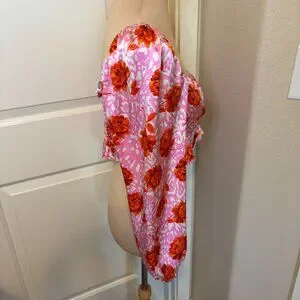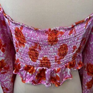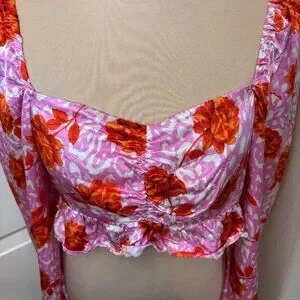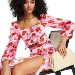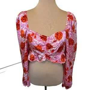Topshop Rose Animal Print Satin Long Sleeve Crop Top in pink with red roses. Cropped with long sleeves, made from satin fabric. This top is so cute, perfect for a concert, festival, or a date night!