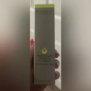 Experience the rejuvenating power of Juice Beauty's eye cream, designed to target fine lines and wrinkles. Encased in sleek gray packaging, this product combines effective skincare with a minimalist aesthetic. Perfect for those seeking a youthful and refreshed appearance.