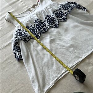 Chic white tank with navy embroidery. Features a stylish ruffle detail. It’s been used but still can be wear.