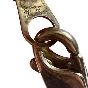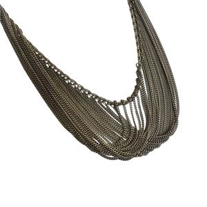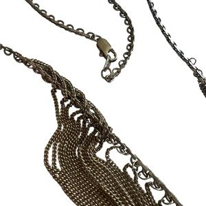 This vintage .925 silver necklace from the 1980s features a dramatic multi-strand fringe design with fine cascading chain links for bold movement and texture. The draped silhouette gives it an elegant, slightly edgy statement look. It has an 8.7-inch drop from the clasp to the top of the fringe, with the fringe itself adding an additional 1 inch in length.