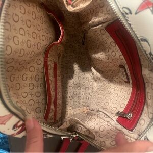 Guess backpack with bold star graphics. Features black and red accents on a white canvas. Minor imperfection on front flap shown in pictures.