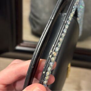 This chic mini bag boasts a striking black and silver design, featuring a glittery silver exterior and a structured crescent shape. Its compact size and elegant contrast make it an ideal accessory for evening events.